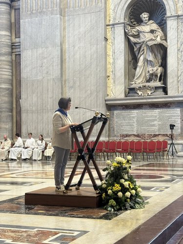 Der Morgen des zweiten Tages startete mit einem beeindruckenden und bewegenden Pilgerweg von der Engelsburg über die Via de la Conciliazione, über den Petersplatz in die Peterskirche. Gemeinsam beteten wir, verbunden über die Kopfhörer, vorne weg abwechselnd Pilgerinnen und Pilger, die ein Holzkreuz trugen und die Gruppe leiteten. Das Tragen des Kreuzes löste tiefe Berührung aus. Der Weg führte vom Obelisken auf dem Petersplatz hinein in den Petersdom durch die Heilige Pforte. Angekommen im Petersdom feierte die Reisegruppe einen Gottesdienst. Ein erhabenes Gefühl machte sich breit, in diesem denkwürdigen Dom, gemeinsam eine Messe zu feiern.